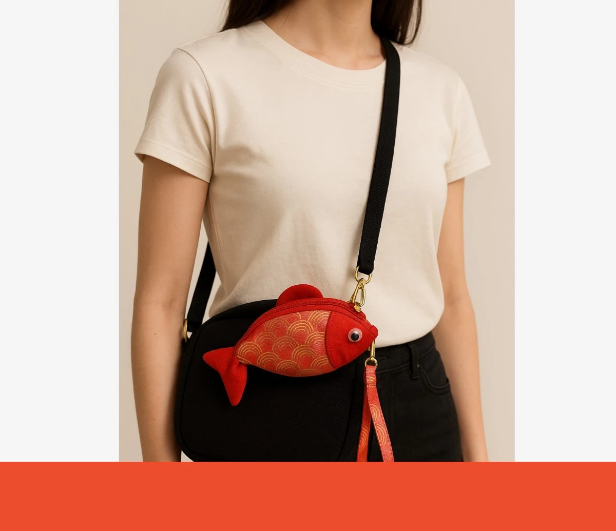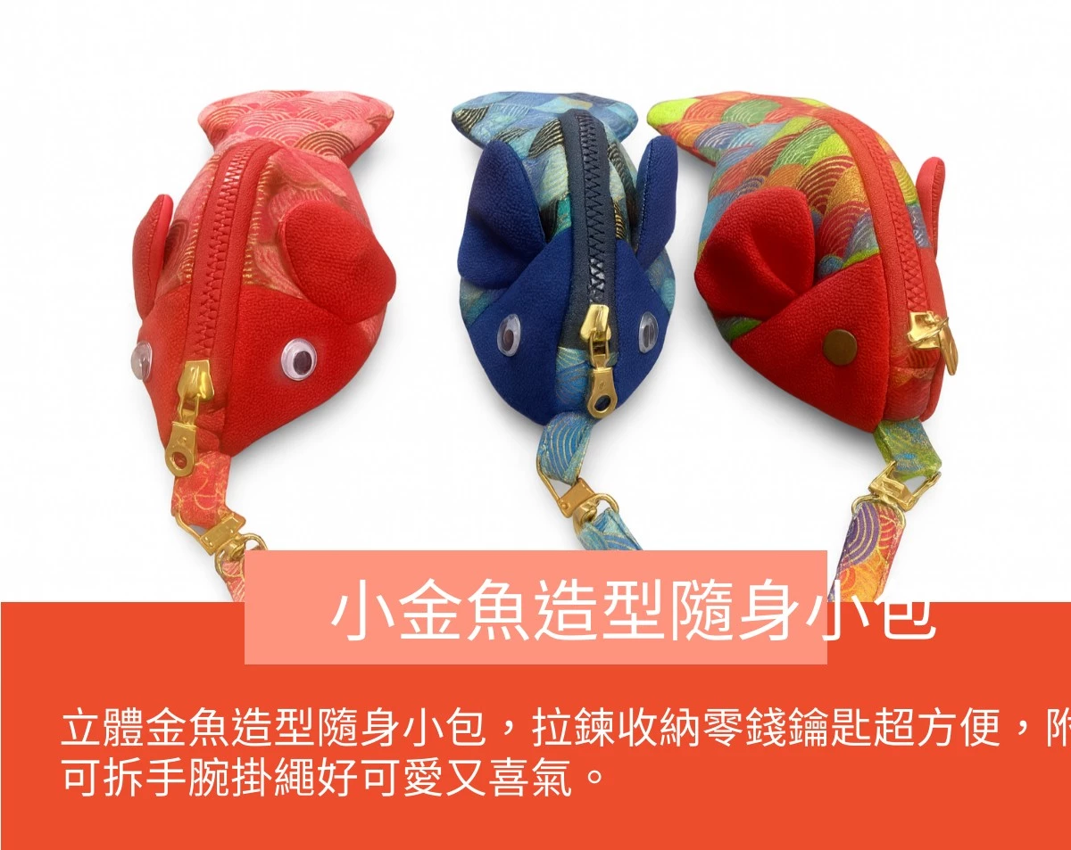 木布拾光「金魚造型小包」以和風布料與立體魚身手作呈現,拉鍊式開口好開好收,適合收納零錢、耳機、鑰匙、護唇膏等日常小物。附掛繩可隨身攜帶、也能掛在包包上當亮點配件;造型可愛、質感不幼稚,適合自用療癒,也很適合送禮。